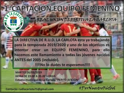 El próximo martes 26 de marzo, la real unión deportiva de La Carlota convoca a todas las niñas nacidas antes de 2005 inclusive, para una jornada de captación para intentar crear su primer equipo femenino.