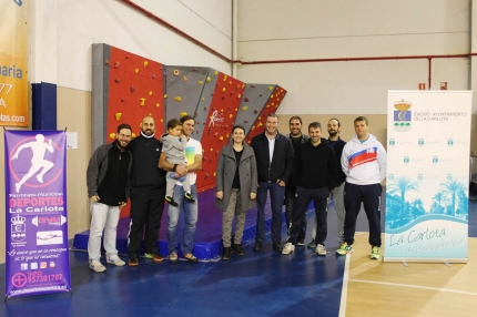 El alcalde de La Carlota, Antonio Granados, junto con la concejala de Deportes, Carmen Suanes, han asistido a la puesta en marcha del nuevo espacio para la práctica de ‘bulder’ que se ha ubicado en una de las pistas del Centro Deportivo Municipal.