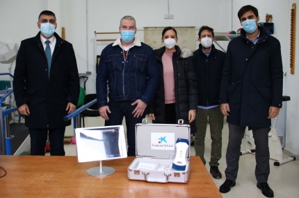 El alcalde de La Carlota, Antonio Granados, junto con la concejala de Bienestar, Gema Baena, han visitado las instalaciones municipales del servicio de fisioterapia en el Centro Deportivo, donde se ha incorporado un nuevo ecógrafo que ha sido donado por la entidad Fundación “La Caixa”, representada por el director de la oficina en la localidad, Enrique Pérez.