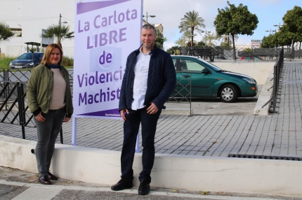 El alcalde de La Carlota, Antonio Granados, junto con la concejala de Igualdad, Raquel Alors, han presentado los nuevos soportes informativos instalados en las entradas de la localidad, en los que se enuncian el lema ‘La Carlota, municipio libre de violencias machistas’.