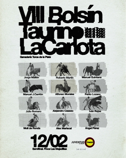 La comisión asesora del Bolsín Taurino ha seleccionado a los doce novilleros que el próximo día 12 de Febrero van a participar en el tentadero clasificatorio para la final del VIII Bolsín Taurino de La Carlota, que se celebrará en los Jardines Taurinos del Hotel El Pilar (La Carlota) el próximo 11 de Marzo.
